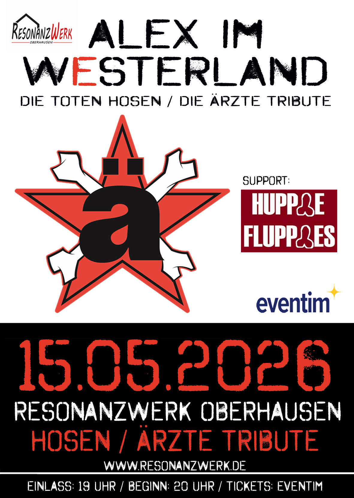 ResonanzWerk Annemarie-Renger-Weg 5, Oberhausen, DeutschlandTickets? Bitte hier klicken...Danke! Hi, wir sind Alex im Westerland!Der Witz und der Charme von DIE ÄRZTE, die Energie und Spielfreude von DIE TOTEN HOSEN: diese Zutaten zu einer explosiven Rockshow zu kombinieren, das Beste aus zwei Welten vereinen: Auf dieser Mission befindet sich Alex Im Westerland! Die 4 Frankfurter rocken sich ganzjährig durch Clubs,