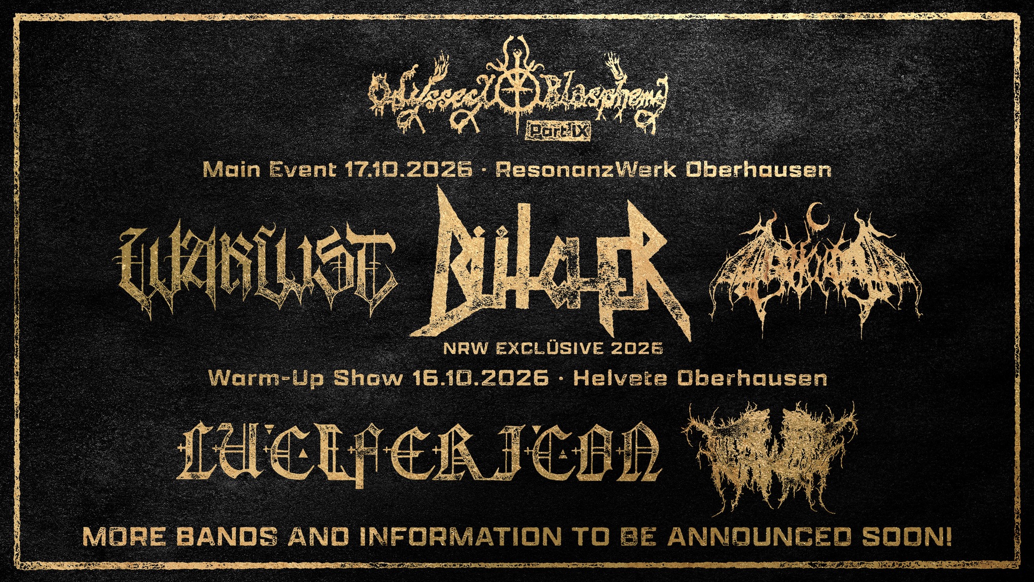 ResonanzWerk Annemarie-Renger-Weg 5, Oberhausen, DeutschlandWelcome to the official event page of the 9th edition of Odyssey To Blasphemy Festival ! The blasphemic festivities will be held for two days in different places :16.10.2026 : HELVETE, OBERHAUSEN with WERWOLF (GER), LUCIFERICON (NL) + more17.10.2026 : RESONANZWERK, OBERHAUSEN with VEL'HAR (GER), WARLUST (GER), BÜTCHER - NRW EXCLÜSIVE 2026 (BEL) + more